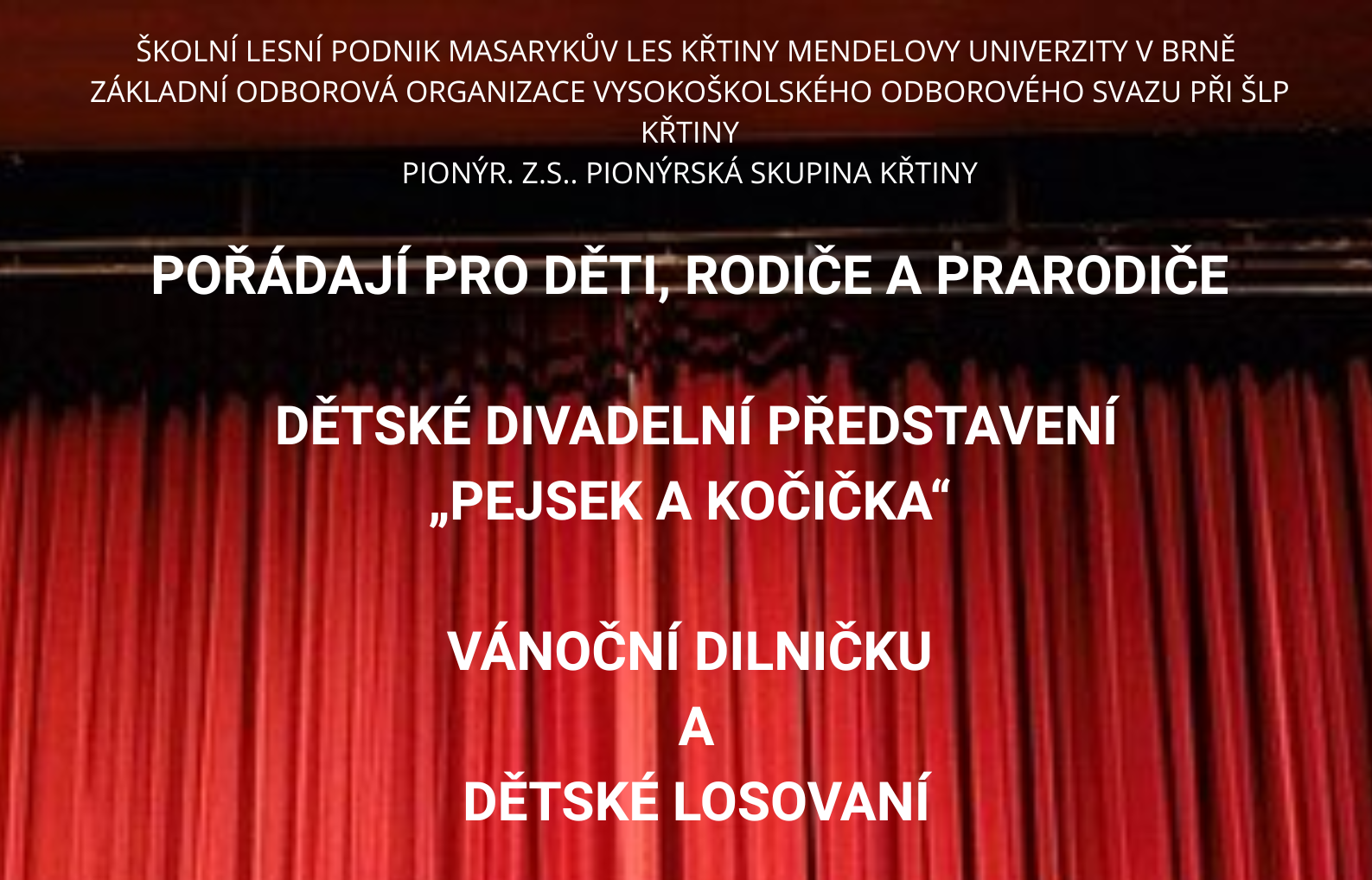 Školní lesní podnik Křtiny a Pionýr Křtiny pořádají Dětské divadelní představení Pejsek a kočička, vánoční dílničku a dětské losování