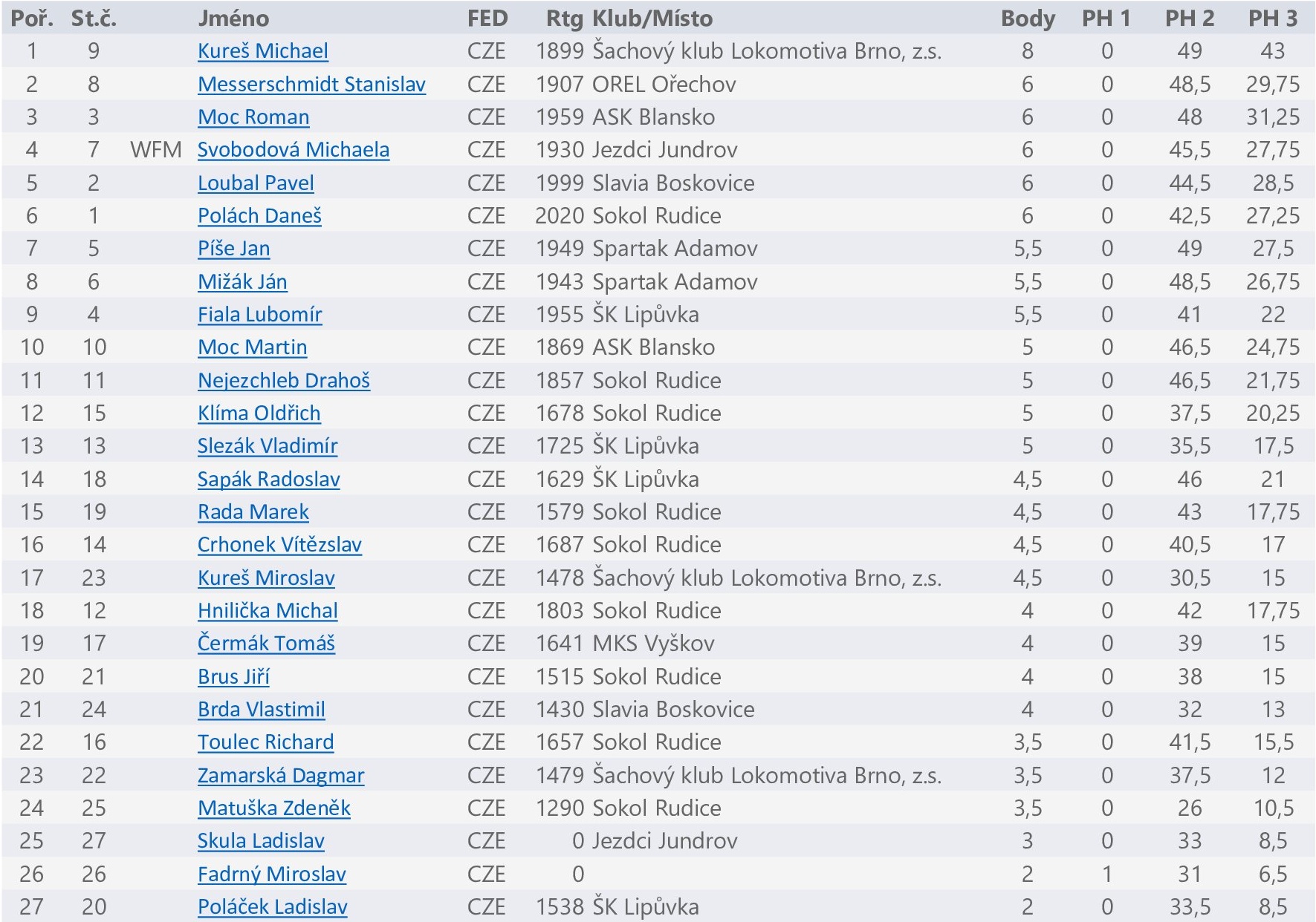 Tabulka konečného pořadí po 9 kolech