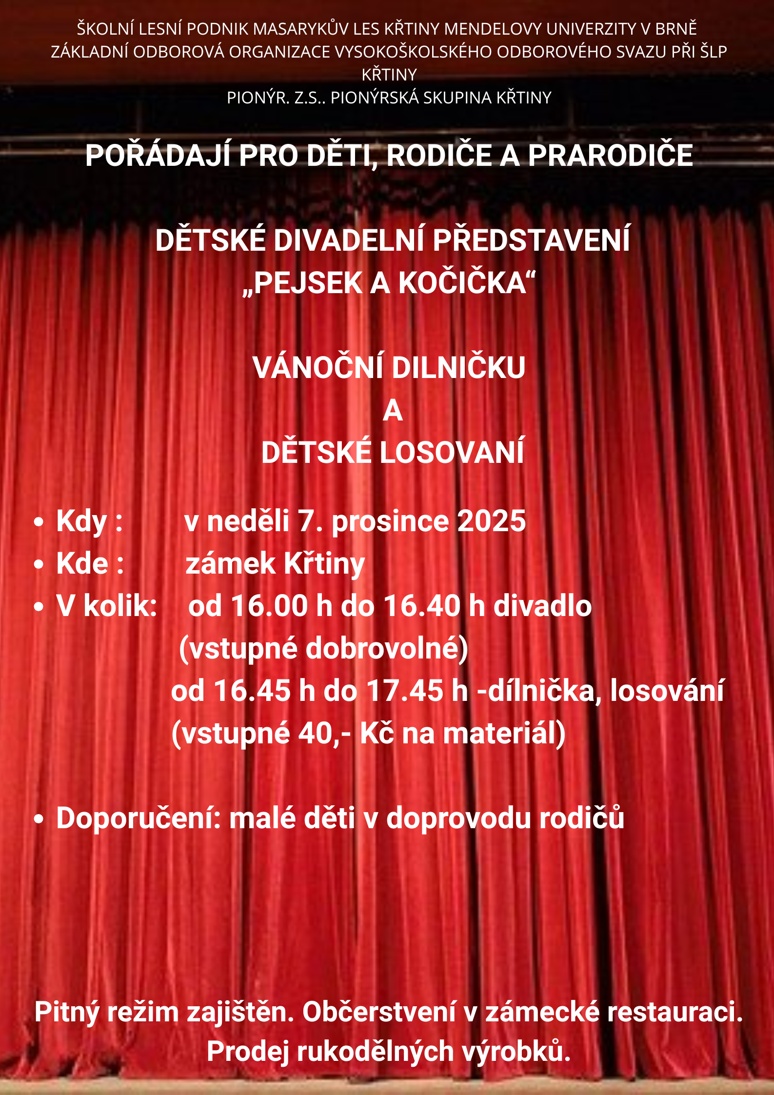 Školní lesní podnik Křtiny a Pionýr Křtiny zvou děti, rodiče a prarodiče na Dětské divadelní představení Pejsek a kočička, Vánoční dílničku a Dětské losování. V neděli 7. prosince na zámku Křtiny, od 16.00 do 16.40 divadlo (vstupné dobrovolné), 16.45 až 17.45 dílnička a losování. Na dílničku se vybárá 40 Kč na materiál. Pitný režim zajištěn, občerstvení v zámecké restauraci, prodej rukodělných výrobků.
