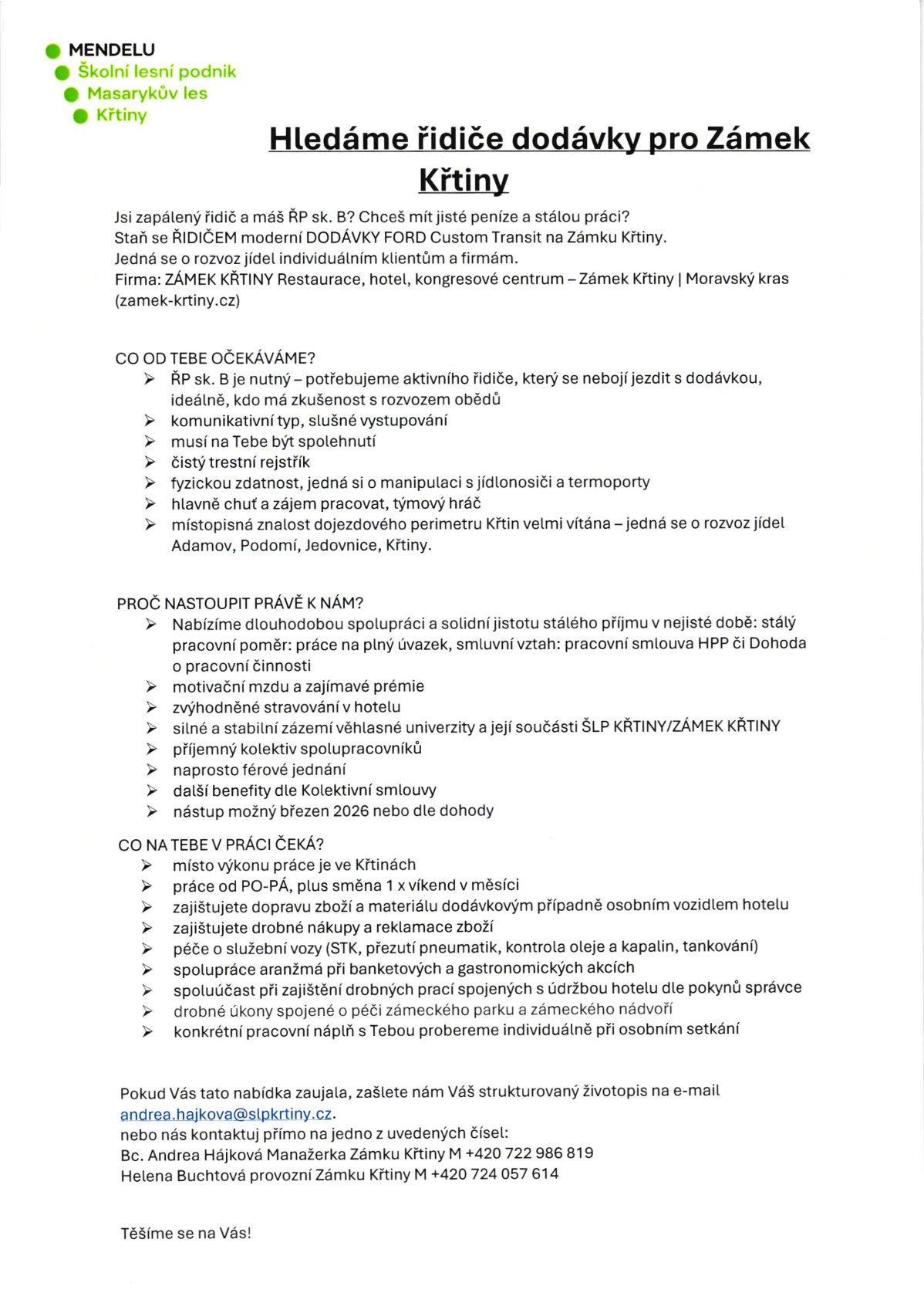 Nabídka zaměstnání - řidič dodávky pro Zámek Křtiny