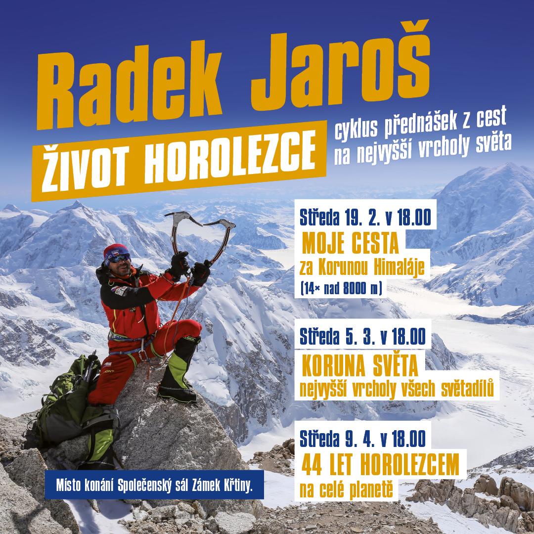 Srdečně vás zveme na cyklus přednášek horolezce Radka Jaroše ŽIVOT HOROLEZCE, v termínech 19. února (Moje cesta za Korunou Himaláje), 5. března (Koruna světa - nejvyšší vrcholy všech světadílů) a 9. dubna (44 let horolezcem na celé planetě) vždy v 18.00h ve společenském sále Zámku Křtiny.Vstupenky na SMS Ticket