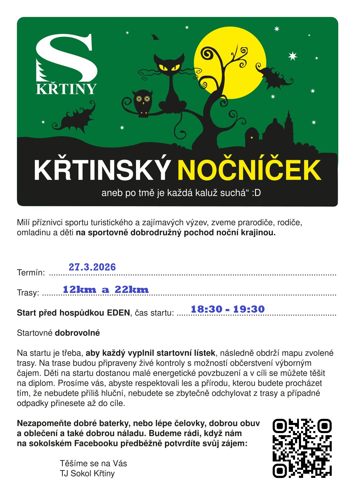 Nezapomeňte čelovky, pevnou obuv a ohleduplnost k lesu. Více info najdete na FB stránkách TJ Sokol Křtiny. Budeme se těšit!