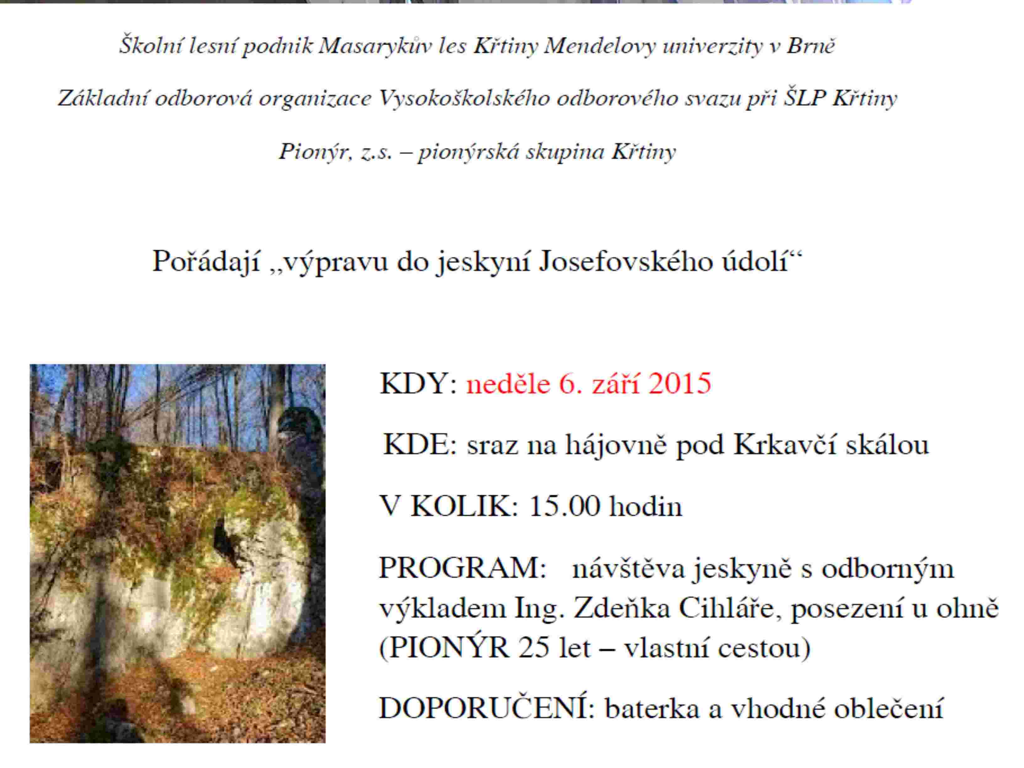 ŠLP Křtiny , odborová organizace při ŠLP Křtiny a pionýrská skupina Křtiny pořádají komentovanou výpravu do jeskyní Josefovského údolí 6.9.2015.